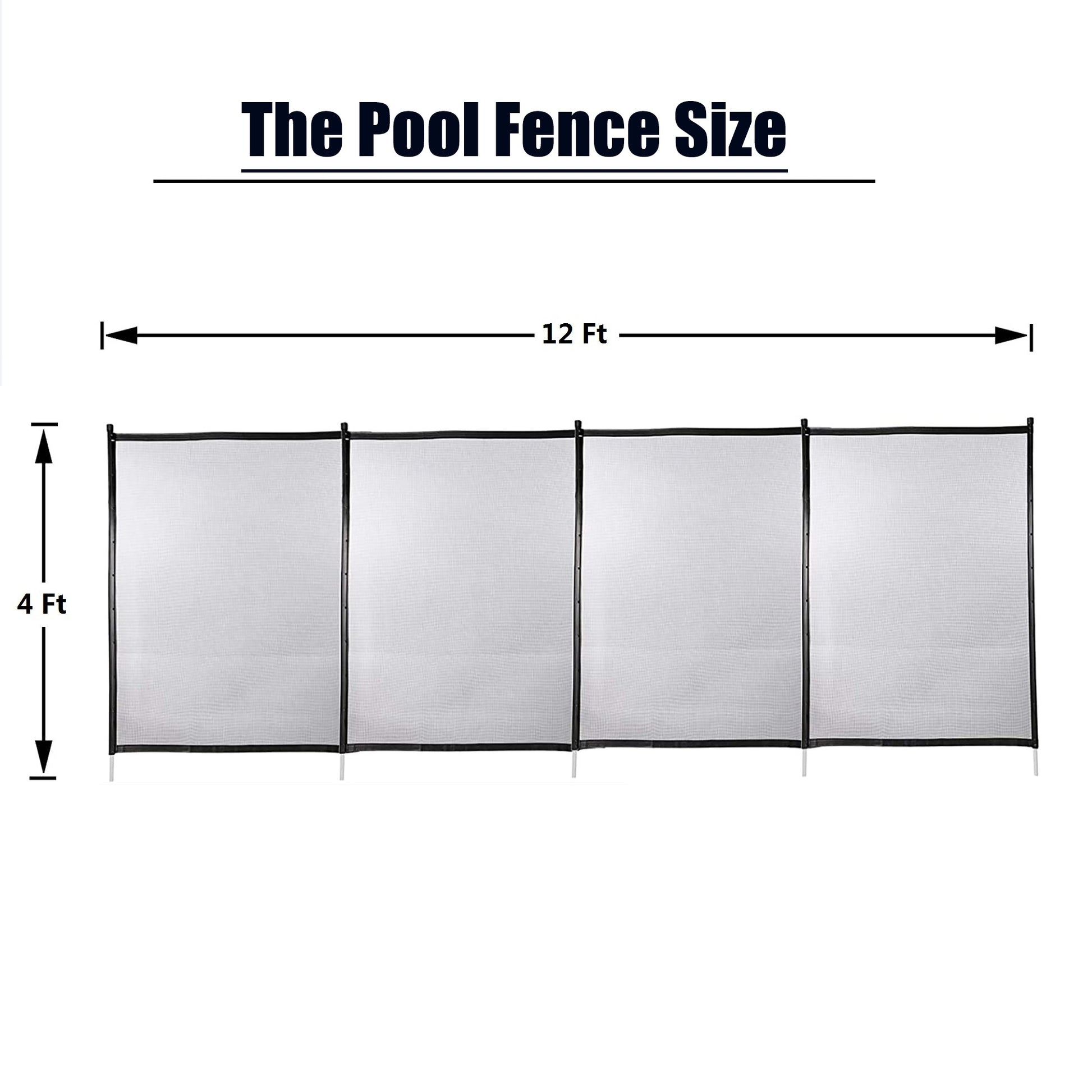 12X4 Ft Swimming Pool Fence:The mesh pool fence is 4-feet tall, 12-feet wide. This height is just enough to prevent people from jumping over the fence,or prevent pets or children from accidentally falling into the pool.