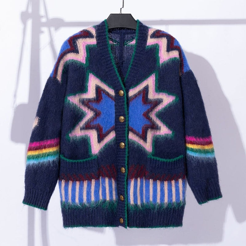 Autumn and Winter New Women Clashing Long-sleeved Knitted Cardigan Jacket Rainbow Jumper Wool Blend