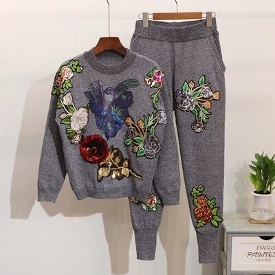 Autumn winter 2 piece set women Embroidery sequin knitted set sweater + trousers pants set Women two piece set fashion tracksuit