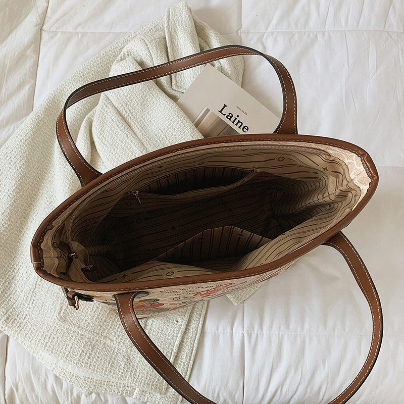 Cartoon bear soft leather graffiti printing tote bag new handbag large capacity shoulder bag
