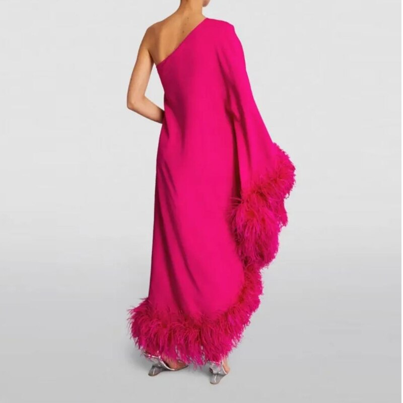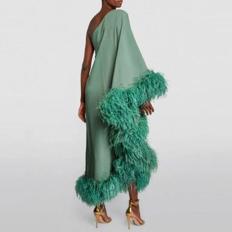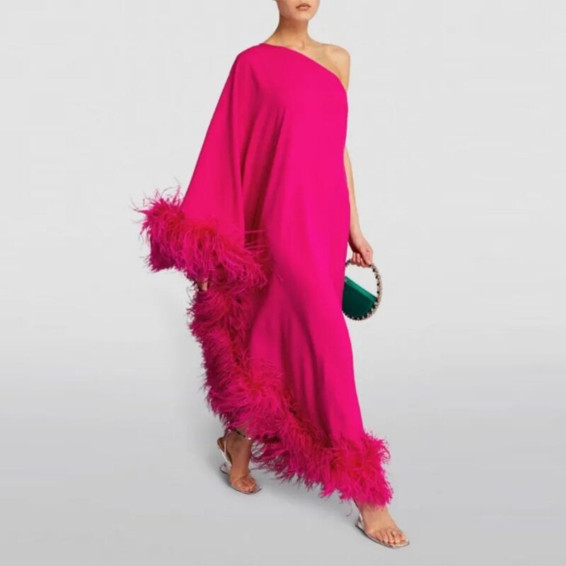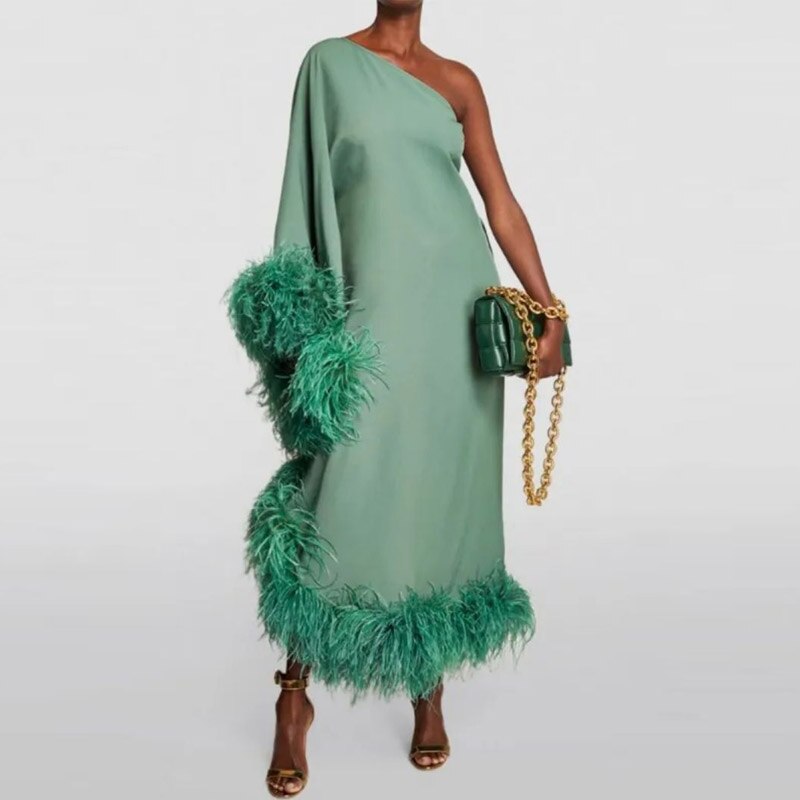 Elegant Silk Feather Flare Sleeve Party Dress Women Sexy Skew Collar Off Shoulder Long Dress Fashion Casual Loose Pullover Dress