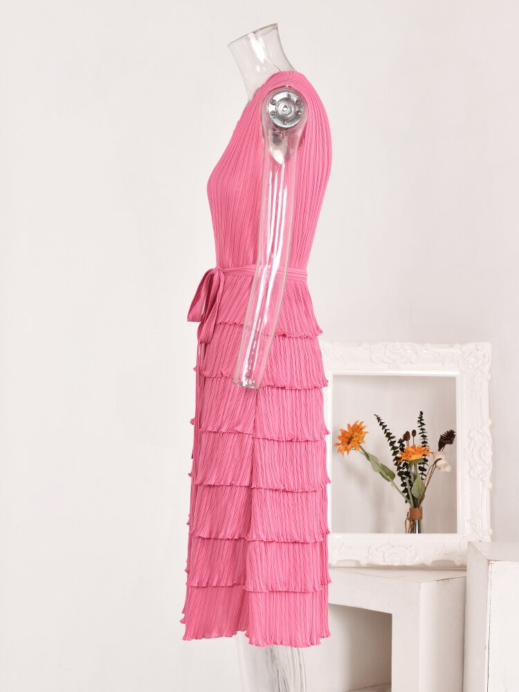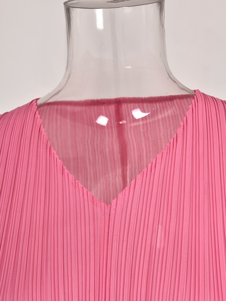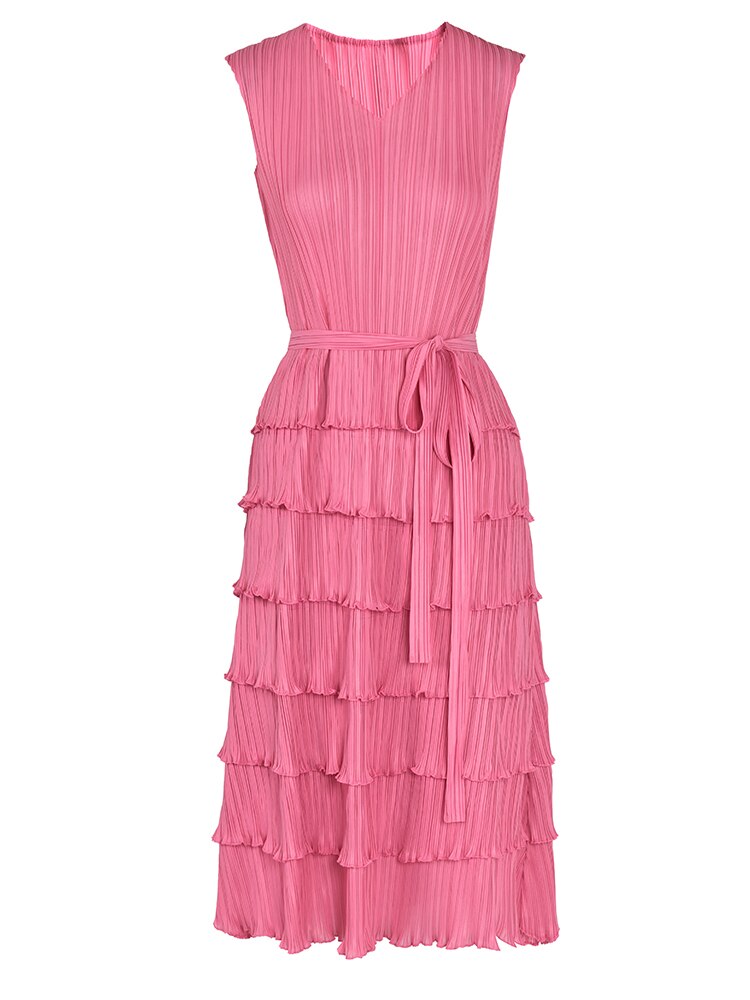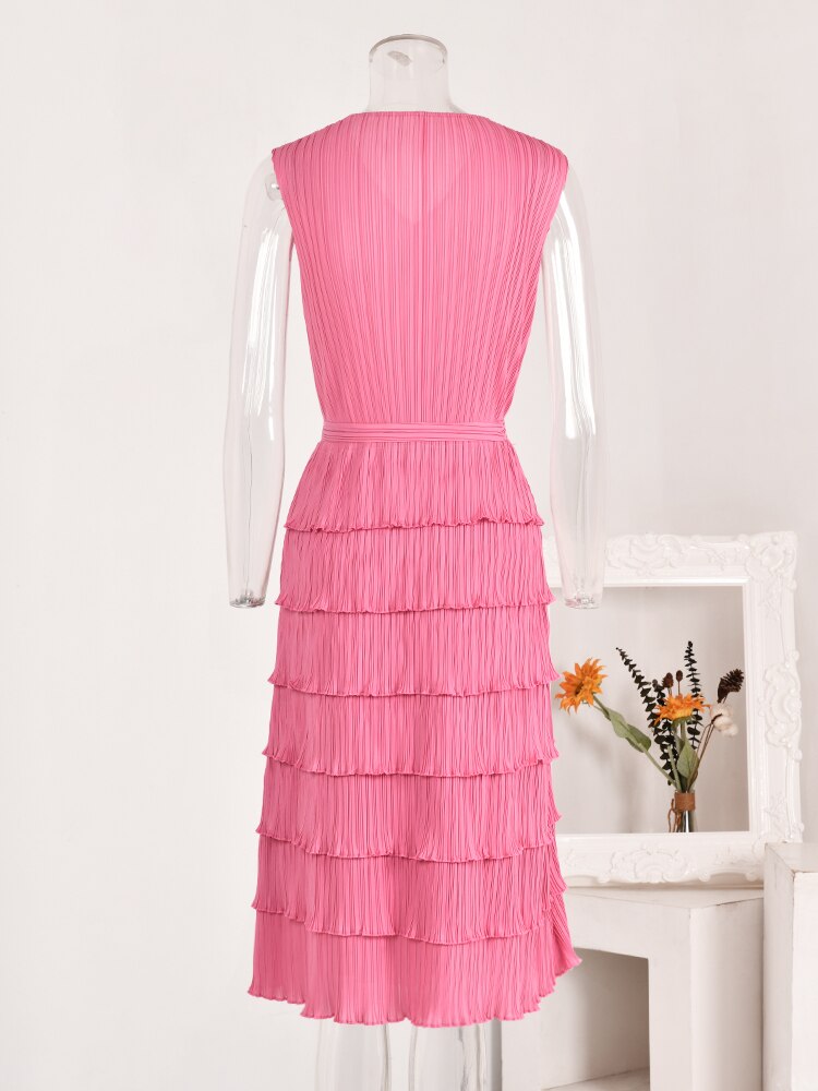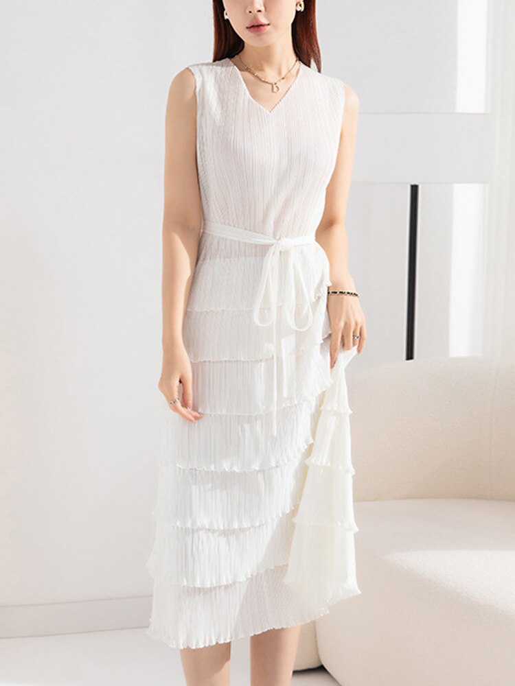 LANMREM Fashion Pleated Belt Dress For Women Solid V-neck Sleeveless Elegant Spliced A-line Dresses Casual New 2La2206