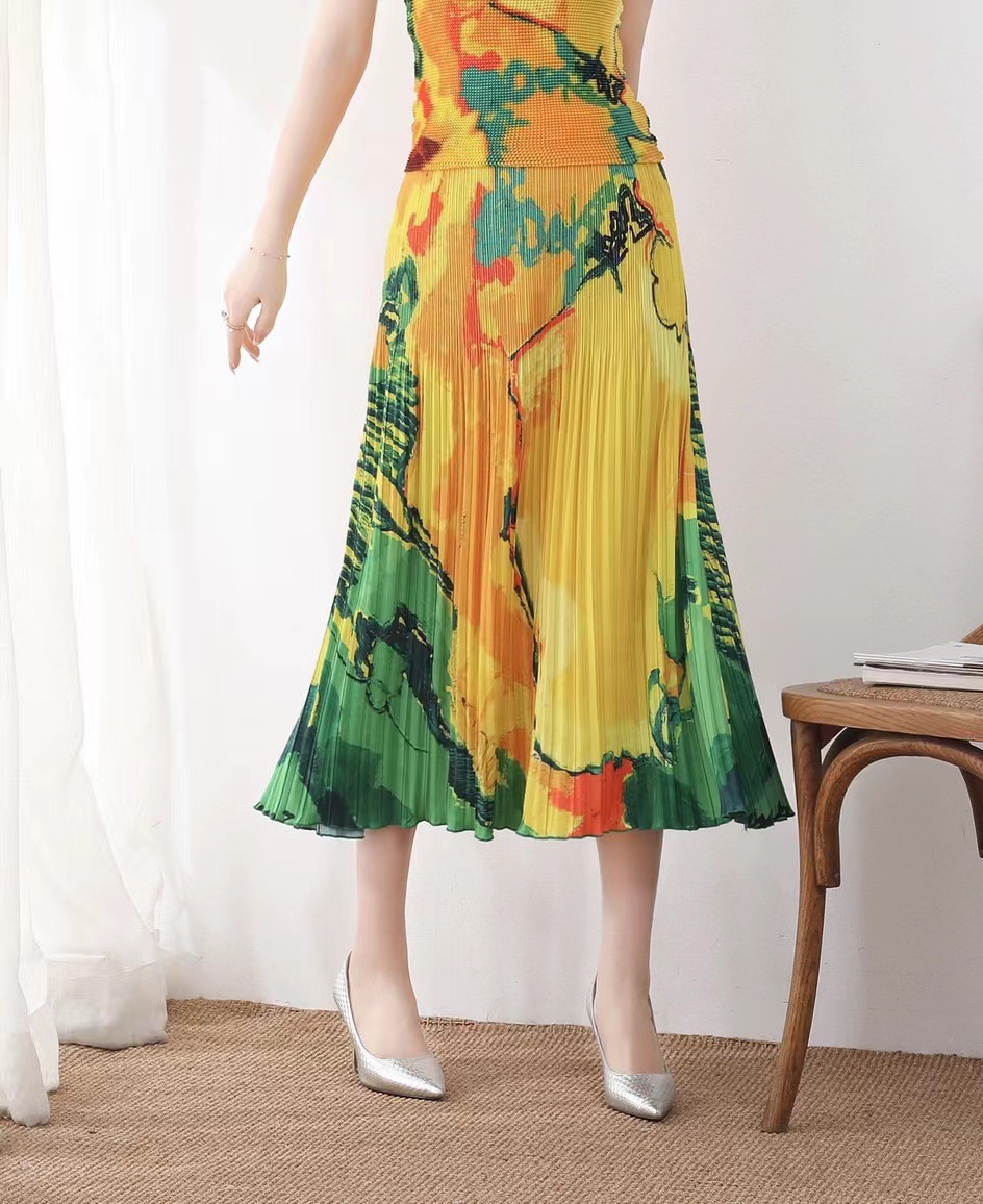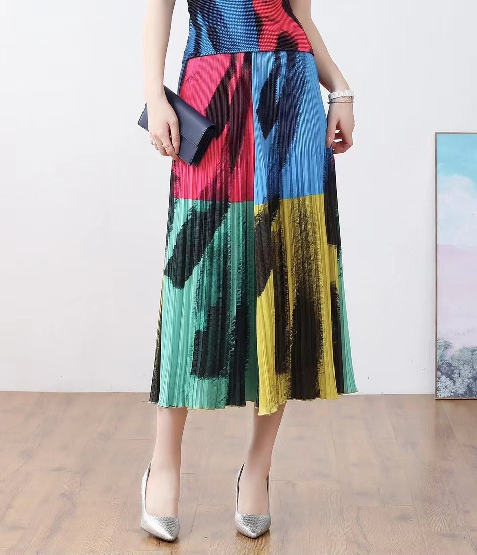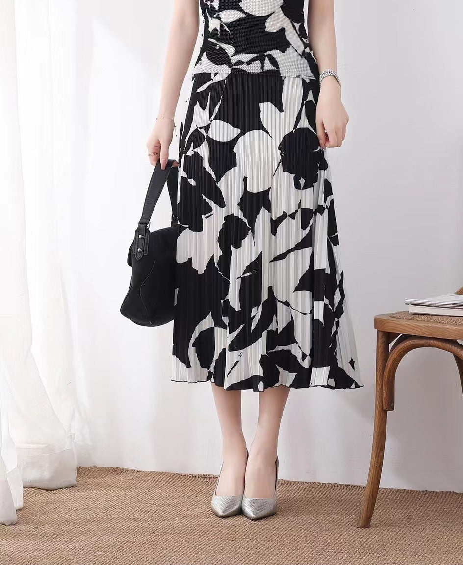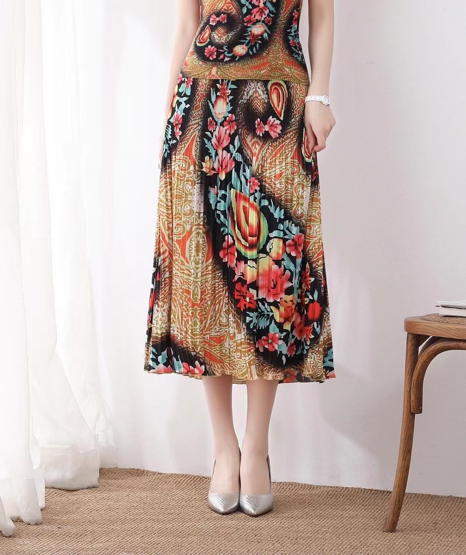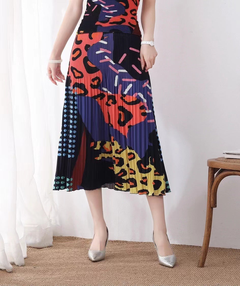 Pleated Skirt Women Printed Large Size Large Swing Mid-Length Versatile Younger Fashion Elegant Skirt