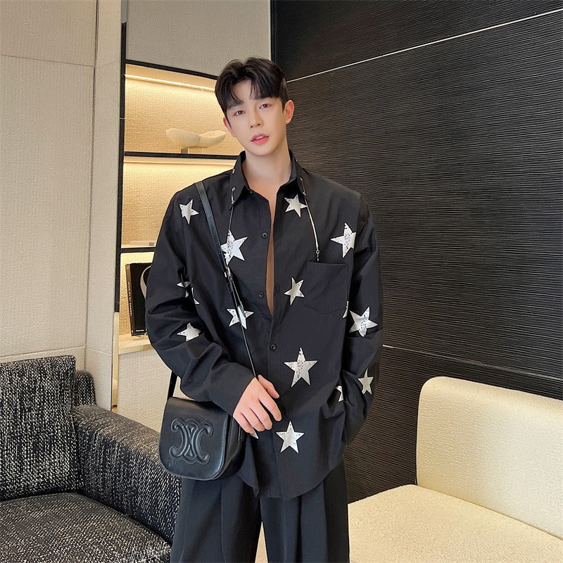Sky Star Printing Trend Caution Machine Shirt Neckline Metal Pendant Top Men