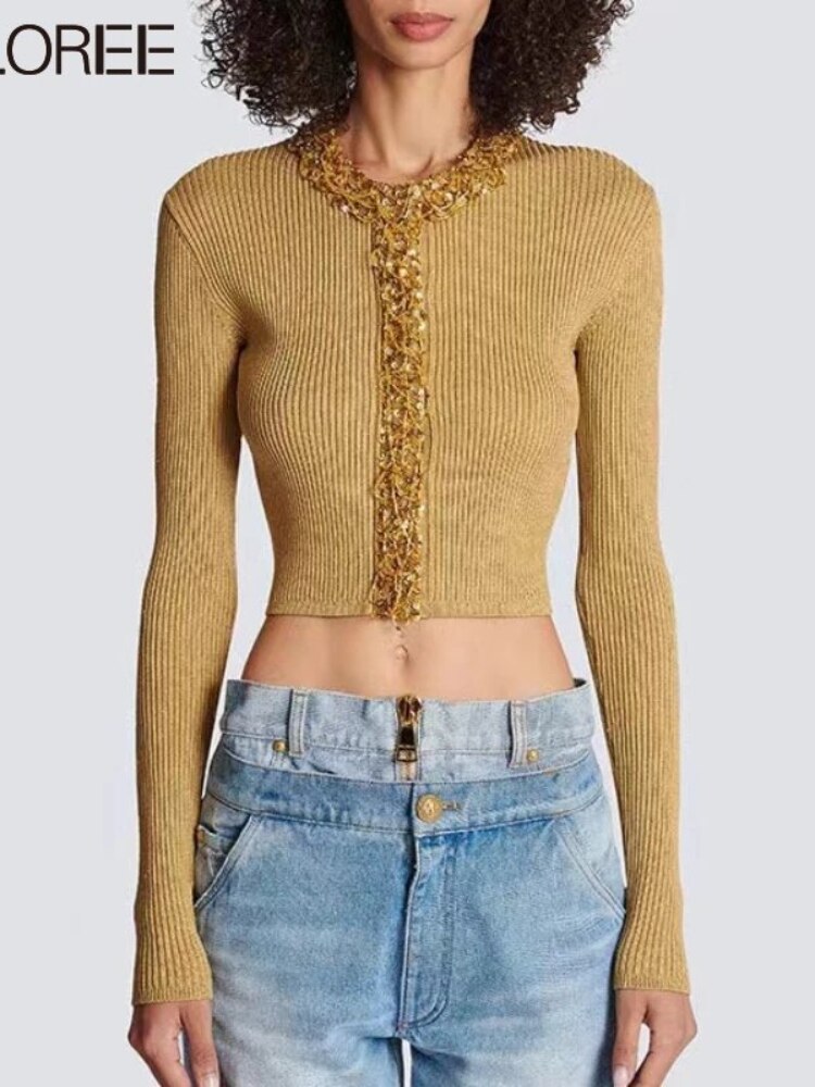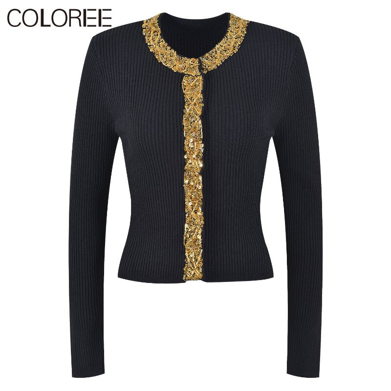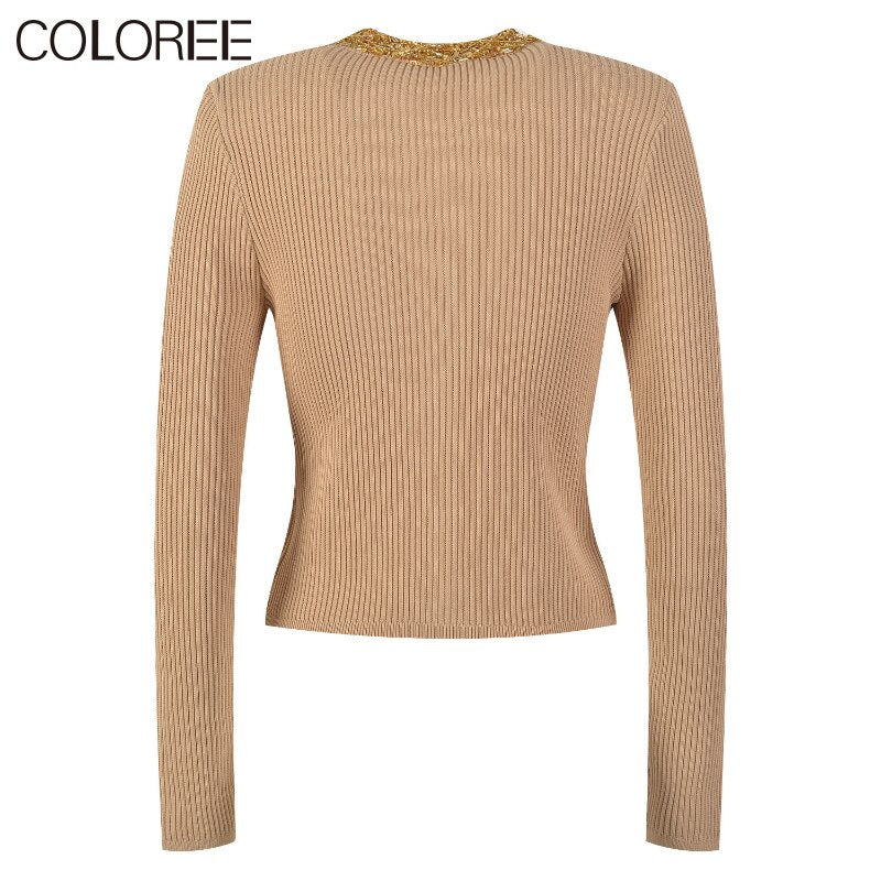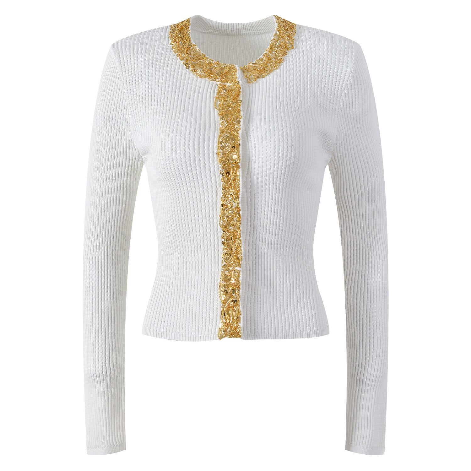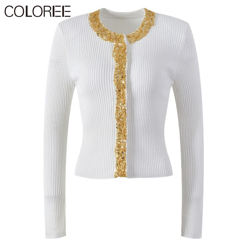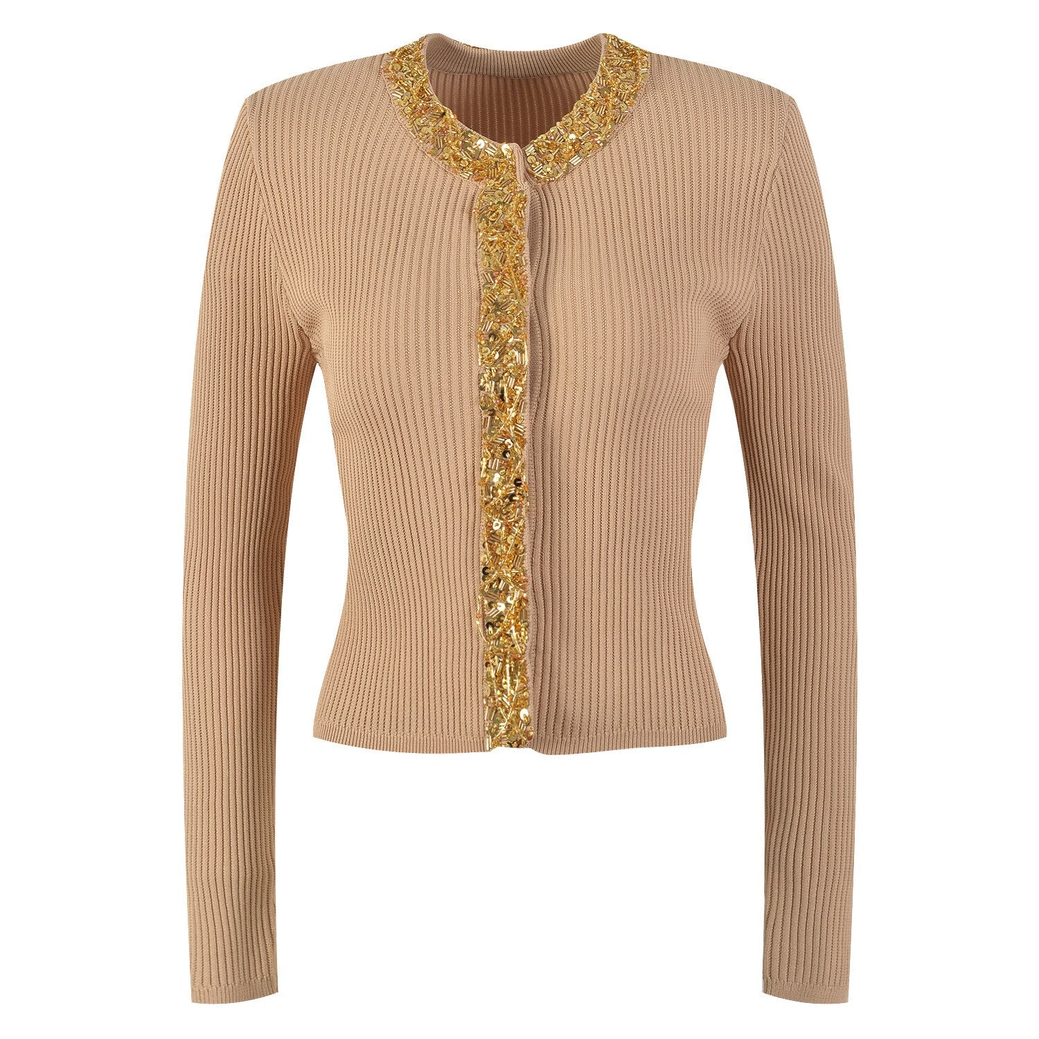 Spring Autumn Long Sleeve Top 2023 Luxury Sequin Beading O-neck Knitted Sweater Women Elegant Cardigans Khaki White Black