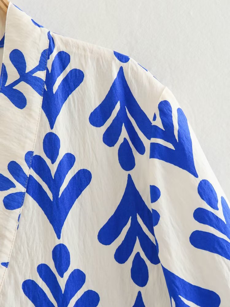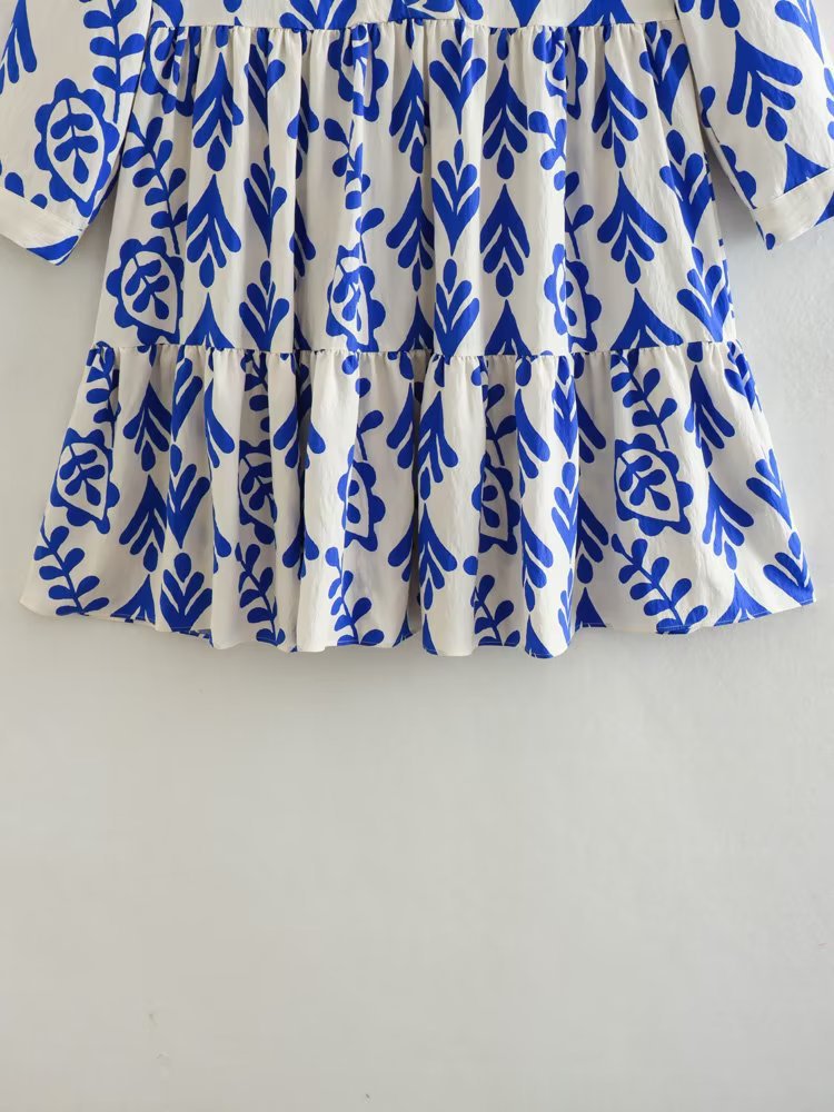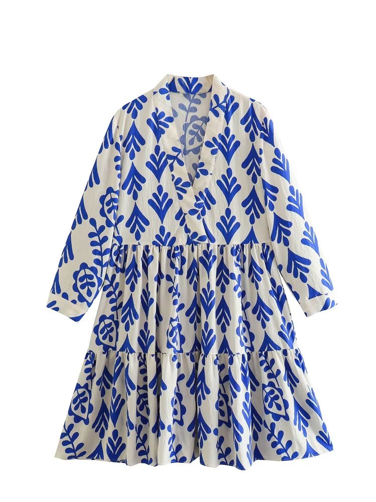 Summer Fashion Women Casual Robe Dress Printed A-Line V Neck Three Quarter Sleeve High Waist Tiered Female Mini Dresses