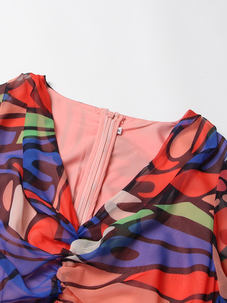 VGH Ruched Print Long Dress For Women V Neck Lantern Sleeve High Waist Colorblock Slim Dresses Female Spring Style Clothes
