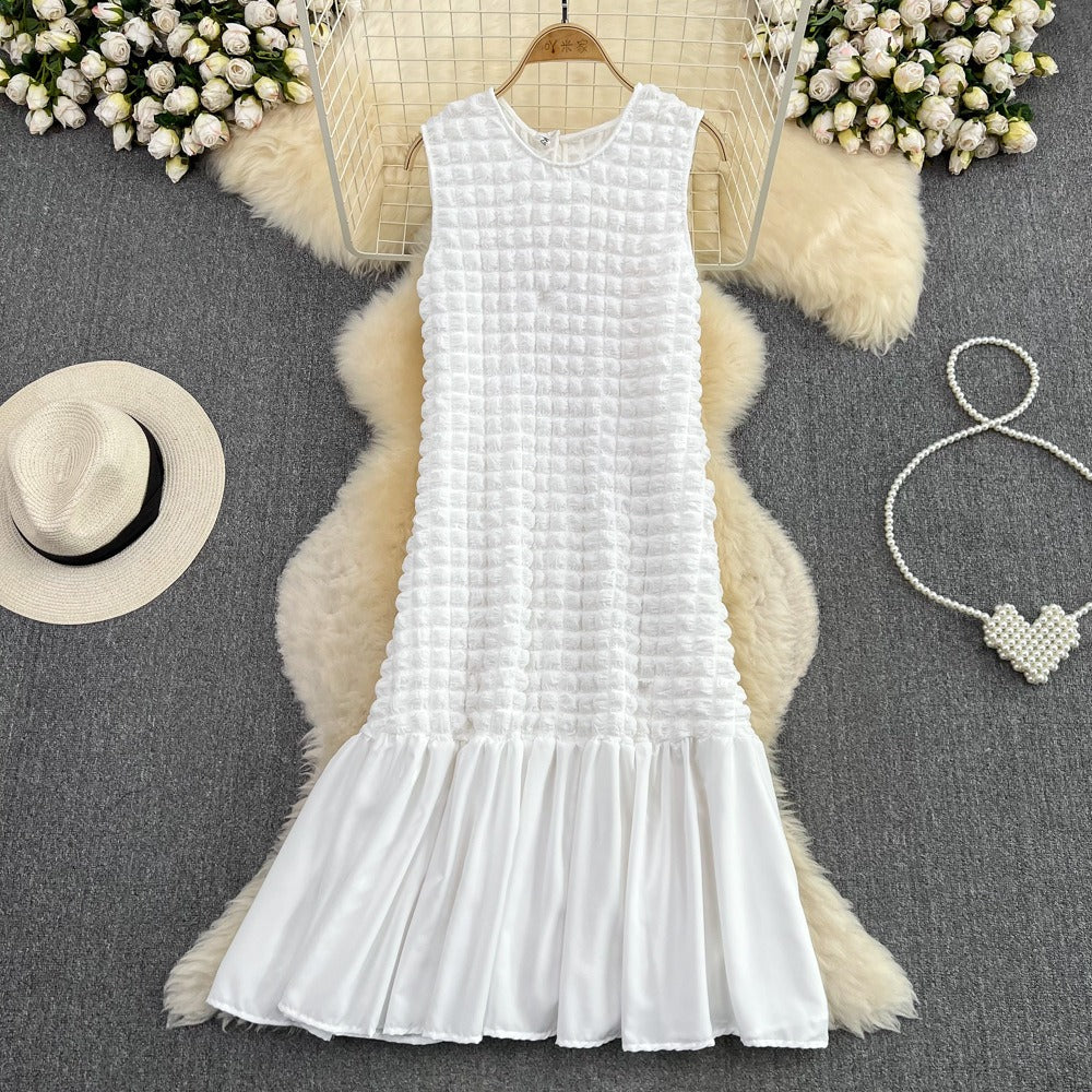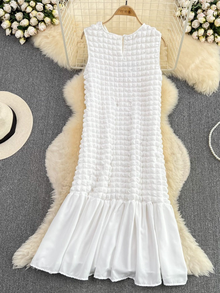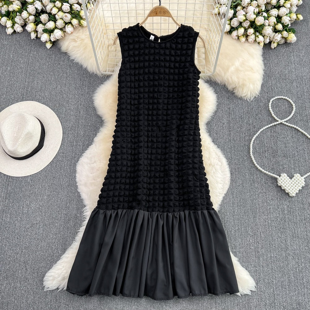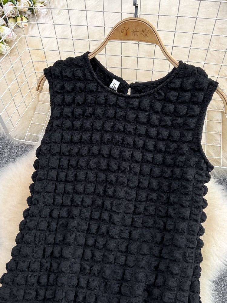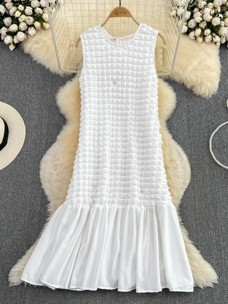 Women Bubble Plaid Vest Dress Solid Color O-neck Loose Dresses