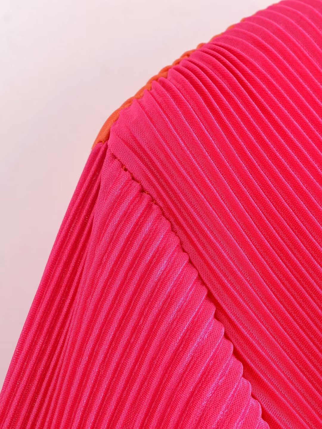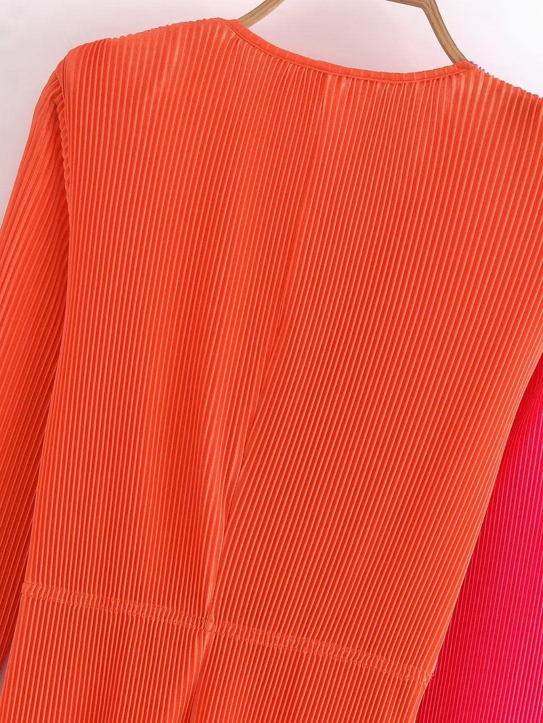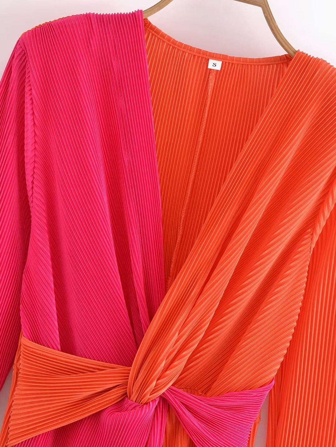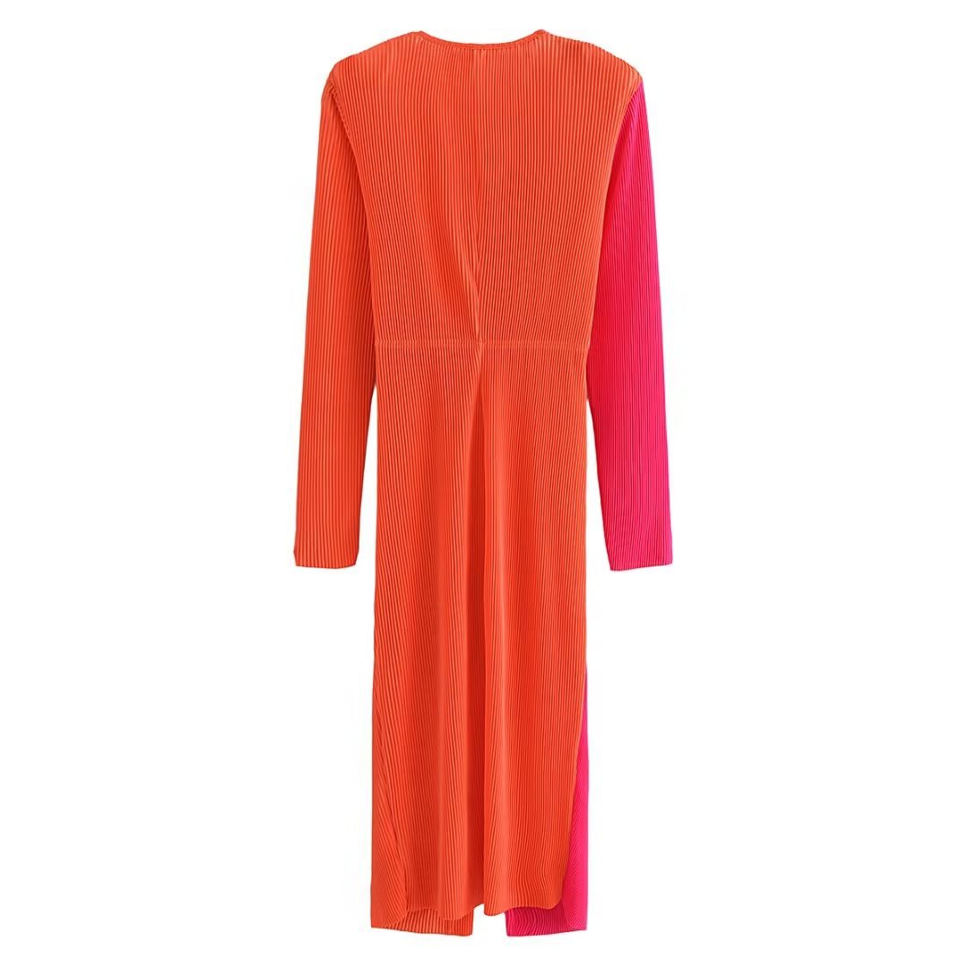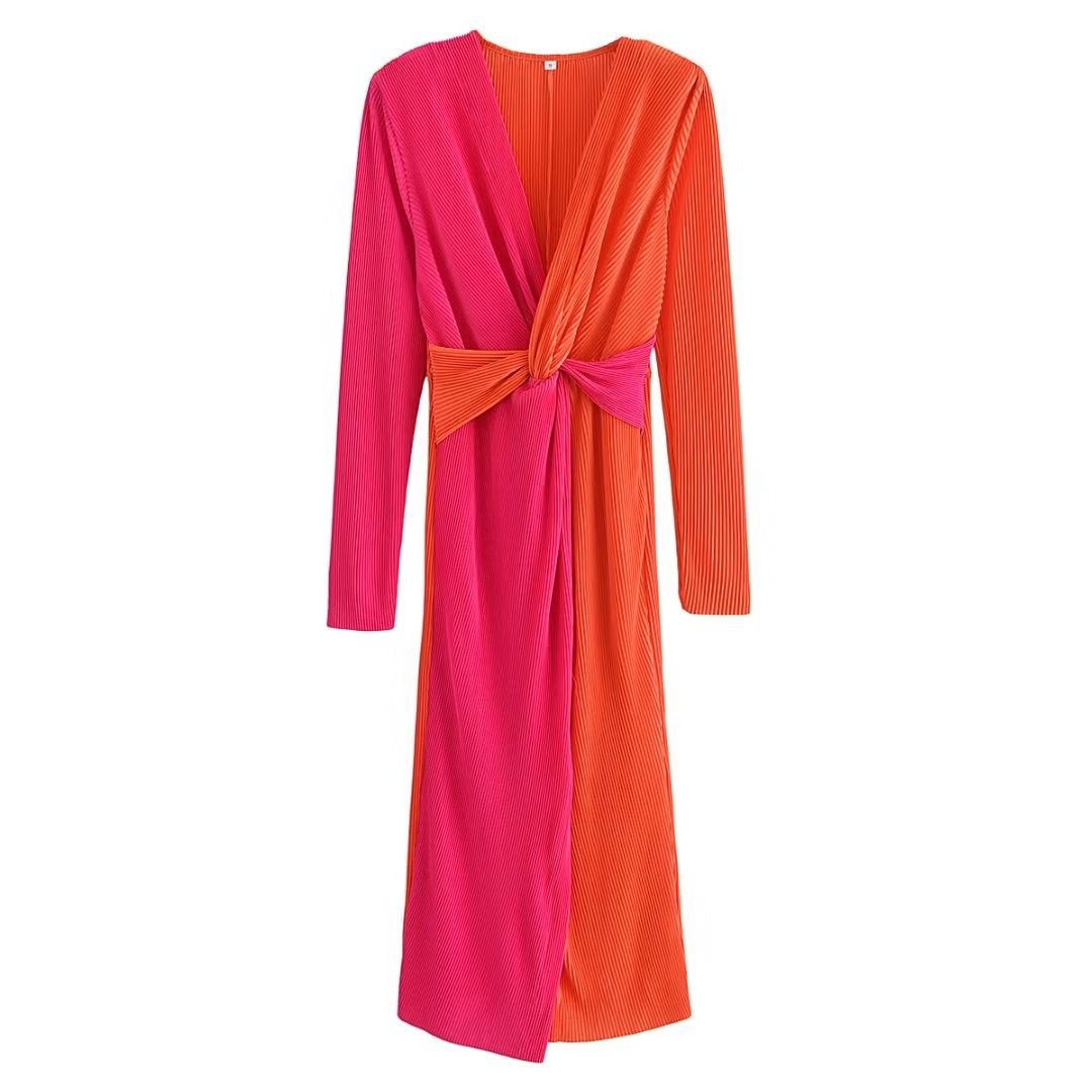 Women Fashion Patchwork Contrast Dress Elegant Cross V-neck Pleated Dresses Female Long Sleeve Robe