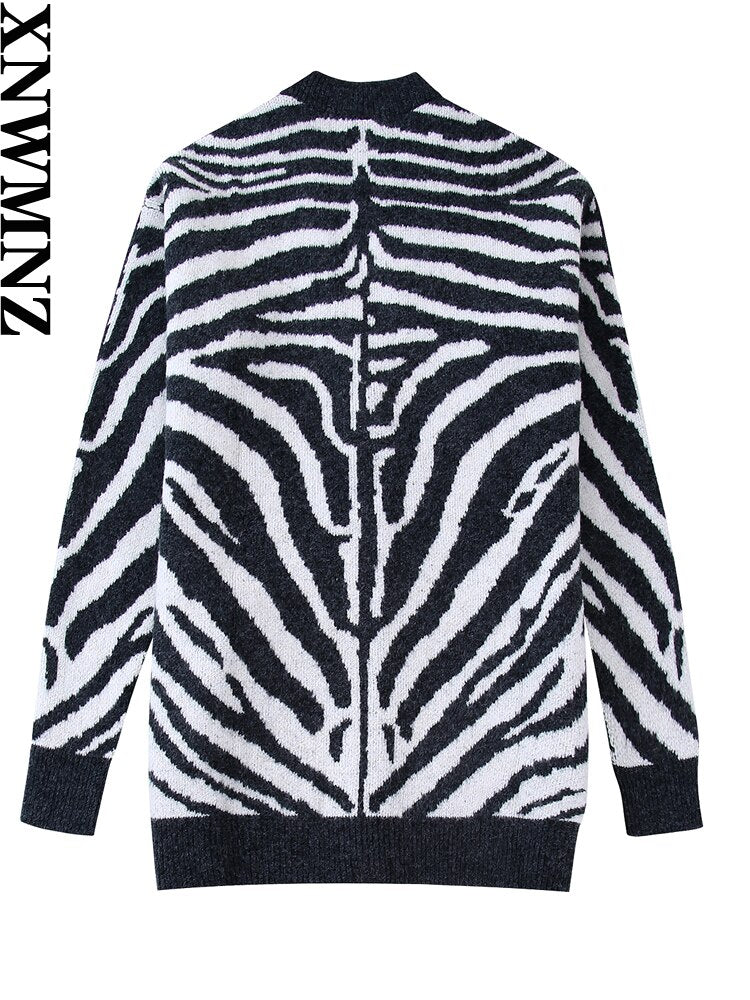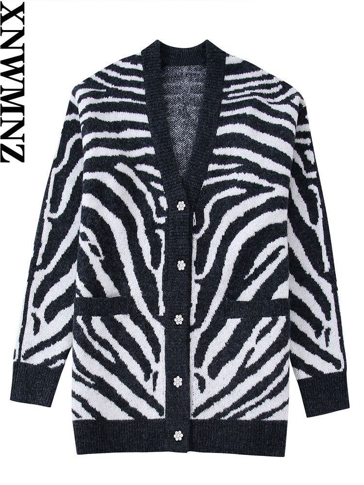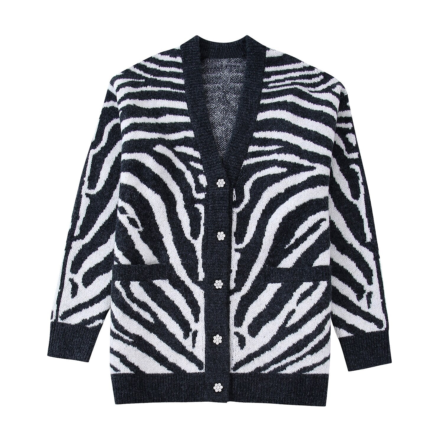 Women Fashion Zebra Print Knitted Sweater Jacket Vintage V-neck Loose Long Sleeve Cardigans Female Chic Coat