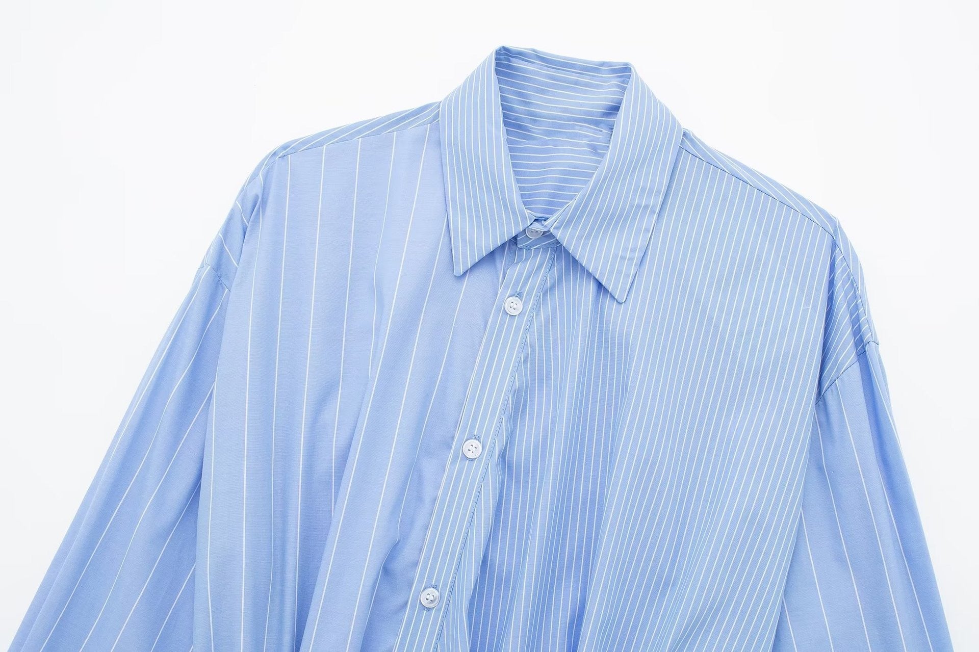 Women's Tie Embellishments Show A Slim Waist With Patchwork Striped Shirt Top